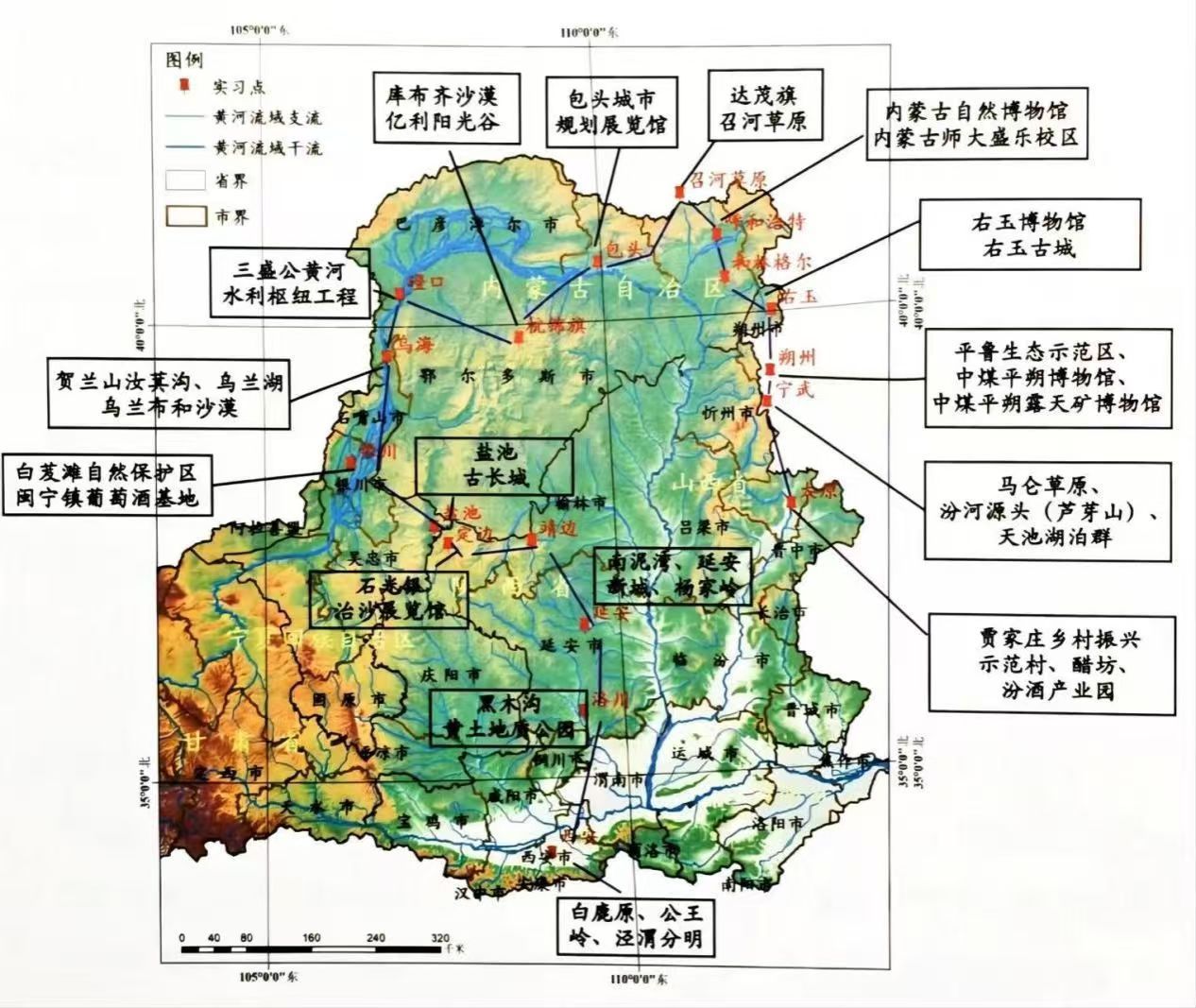 2025年第十六届全国高校地理学联合野外实习路线简图沿途,实习队伍关注“黄土”“黄河”“黄沙”,途经西安、盐池、磴口、太原等18个核心实习区域,探究黄河“几字湾”的自然过程耦合机制、人地关系协调路径、生态屏障建设模式等核心问题,培养从“要素认知”到“系统治理”的进阶思维,为筑牢北方生态安全屏障提供了科学认知和人才支撑。
