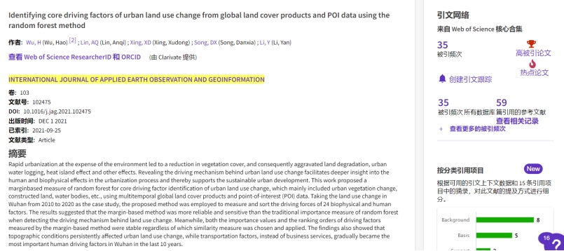 据ESI最新检索数据显示,华中师范大学城市与环境科学学院吴浩教授团队发表在国际著名学术期刊International Journal of Applied Earth Observation and Geoinformation(中科院一区TOP)论文“Identifying core driving factors of urban land use change from global land cover products and POI data using the random forest method”入选ESI地理科学领域最优秀的前0.1%热点论文。该研究利用地理时空大数据,提出一种基于随机森林间隔序列的城市土地利用变化驱动力挖掘方法,精准刻画自然与社会因素的影响因素及作用机理,深刻揭示了当前我国快速城镇化背后的驱动机制。