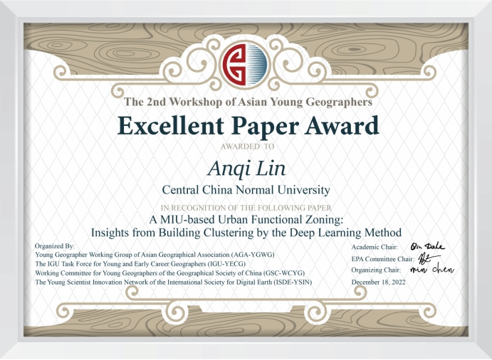 林安琪博士后参加Geospatial Sciences for land Management分会场的主题汇报,报告主题为A MIU-based Urban Functional Zoning: Insights from Building Clustering by the Deep Learning Method,提出一种利用建筑物深度聚类来优化城市功能区识别的方法,经组委会评议,荣获本次大会优秀论文奖。