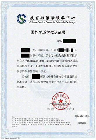 按照华中师范大学和美国科罗拉多州立大学共同制定的培养标准,修满32学分的学生,可获得由美国科罗拉多州立大学颁发的旅游管理硕士学位证书。该学位证书可在教育部留学服务中心官网进行学历学位认证。
