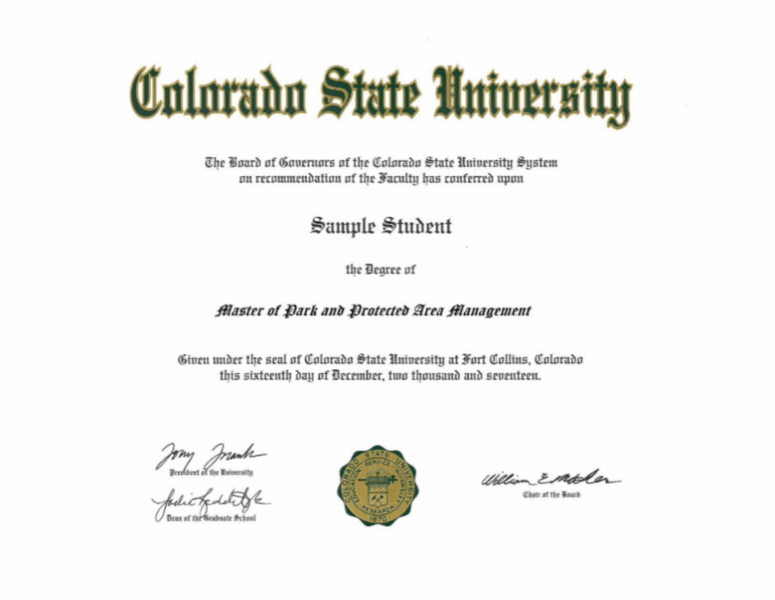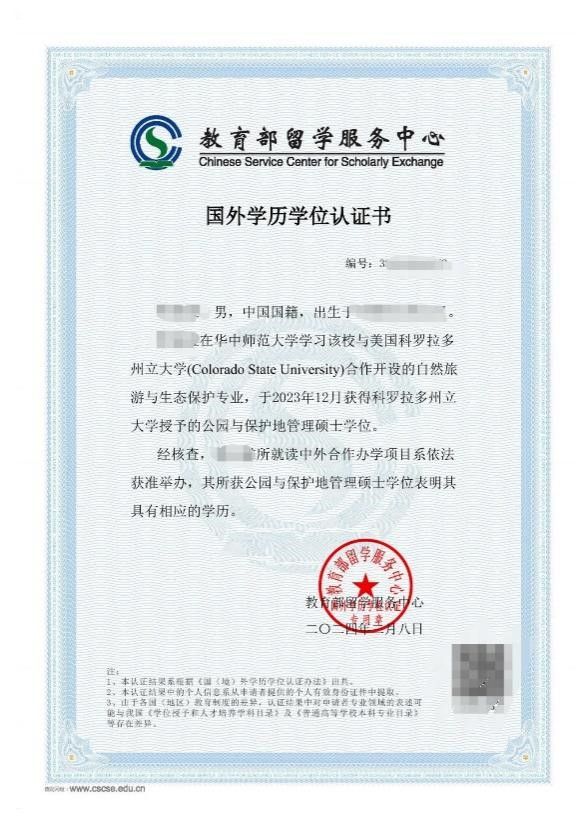 按照华中师范大学和美国科罗拉多州立大学共同制定的培养标准,修满35学分的学生,可获得由美国科罗拉多州立大学颁发的公园与保护地管理硕士学位证书。该学位证书可在教育部留学服务中心官网进行学历学位认证。
