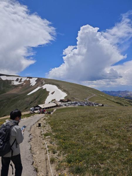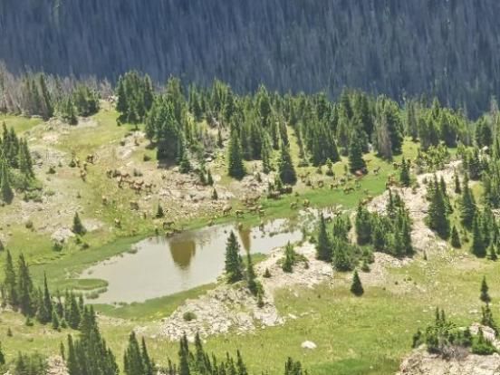 7月15日,实习队乘大巴抵达落基山国家公园,首先探访了熊湖。湖畔景致随步移而变幻,湖水蓝绿交织,周边斜坡上,“马刀树”因土屑蠕动而呈现主干与地面的独特夹角,成为生物适应地貌的直观样本。随后,登顶参观了公园内全美海拔最高的Alpine游客中心。沿途,学生们体验了山地景观从森林到高山草甸、苔原的垂直变化,还多次遇见正在转移的野生鹿群。