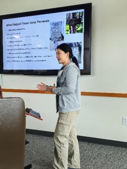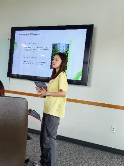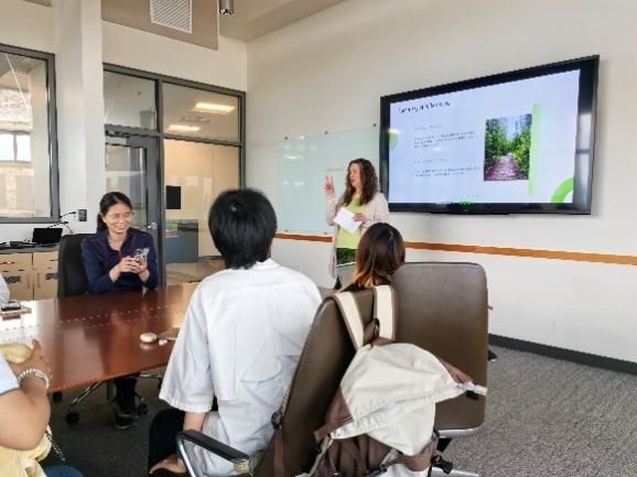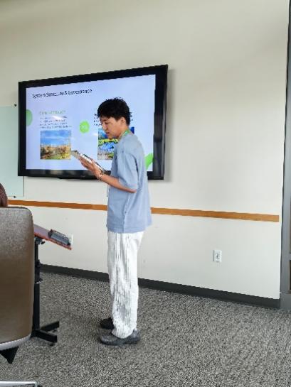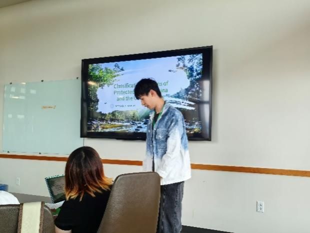 7月16日,自然资源人文系的主任Tara Teel教授以及所有参与实习设计、准备、指导的老师们在华纳自然资源学院402室欢聚一堂,实习小组进行总结汇报。四个小组分别聚焦“冰川作用及其地貌证据”“柯林斯堡游憩体验中的人—地关系”“野外实习体验与感受”“中美保护区分类体系的比较”等主题进行了PPT汇报、视频展示。