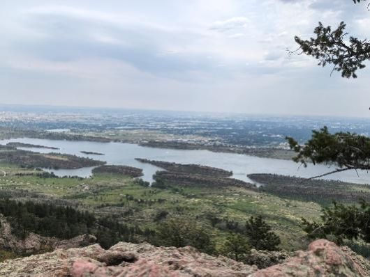 Lory州立公园的Arthur's Rock徒步是另一场“专业试炼”。经过前半段的连续上坡土路,后半段的乱石嶙峋陡坡艰难行走2.7公里到达山顶,开阔的视野让所有疲惫烟消云散。站在淡粉色花岗岩山上,向东看远处是一望无际的山前大平原,柯林斯堡的城市轮廓与周边的农田相间铺陈,近处可俯瞰三列南北向延伸的红层单面山及其间的马齿水库,山腰向下是洪积扇,向西则是落基山的层峦叠嶂;一幅完整的地貌形态组合图。沿途,龚箭老师给大家讲解了州公园的“多元游憩系统”,当徒步道、山地自行车道、骑马道重叠时,要严格遵循“优先权规则”——骑马者优先于骑行者,骑行者优先于徒步者,因为马匹受惊后反应更剧烈,自行车制动距离更长,这种规则本质是为了降低风险。