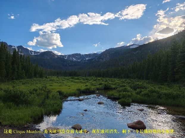 下山途中,伍铁牛老师给大家讲解了U型谷、多级冰斗及其成因,并结合现场实际教授了冰川地貌的识别方法。在山脚下公园东入口处的Estes Park旅游小镇,实习队开展了人文调研,师生们漫步于石板街道,观察建筑沿山麓高低错落布局,与自然景观相融合的方式,体会配套齐全又“低影响”的开发模式,感受特色风土人情。