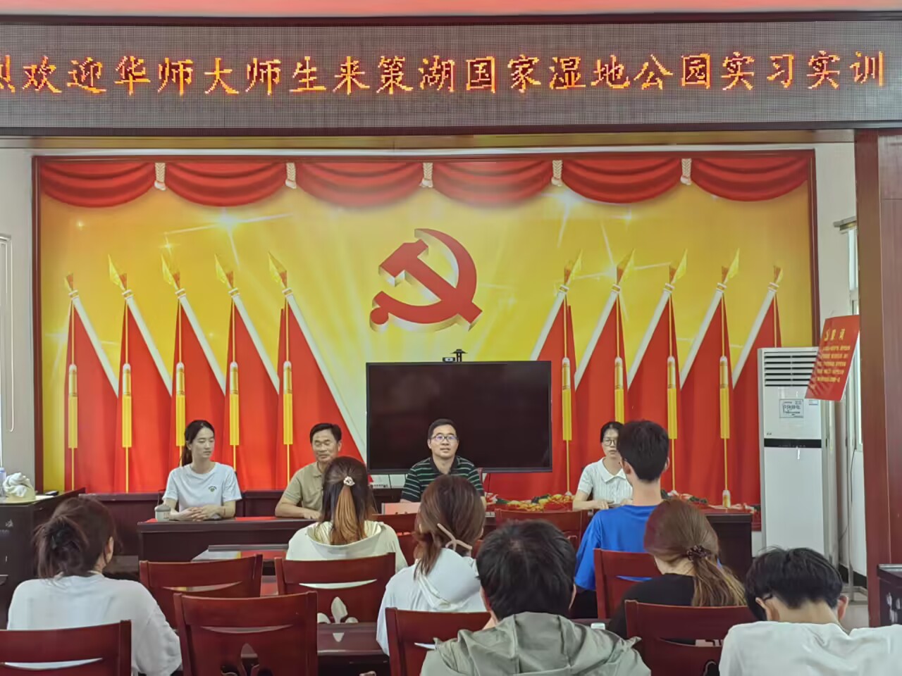 游览结束后,策湖国家湿地公园管理处李部长和柯部长与同学们进行深入的交流,对策湖的基本情况、地理位置、区位条件、治理历程、行政管理体制等进行了详细介绍。围绕当前策湖湿地公园保护中的典型问题、治理措施、管理困难,同学们踊跃提问和发言,进一步加强了相关理论和实践知识的了解和认识。最后,带队老师崔家兴强调,此次实习是理论与实践相结合的宝贵机会,希望同学们在实践中发现问题、解决问题。此外,同学们还应自主学习生态保护方面的国家政策制度、措施,为未来就业提供相应知识储备,从而在山水林田湖草的全域全要素保护中发挥学科优势,彰显地理学子的风采。