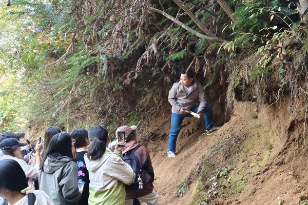 10月27日,实习队伍前往远安县洞沟、鸣凤山景区、旧县镇三地继续进行地质地貌实习。上午同学们在洞沟运用地质罗盘测定岩石的产状,通过实操加深了对新构造运动的认识。下午,队伍行至鸣凤山景区,近距离观察了丹霞地貌、河流地貌等地貌类型。傍晚,实习队到达旧县镇,远眺群山与河流,学习了沮河的走向、河漫滩、河流阶地以及夷平面的相关知识。