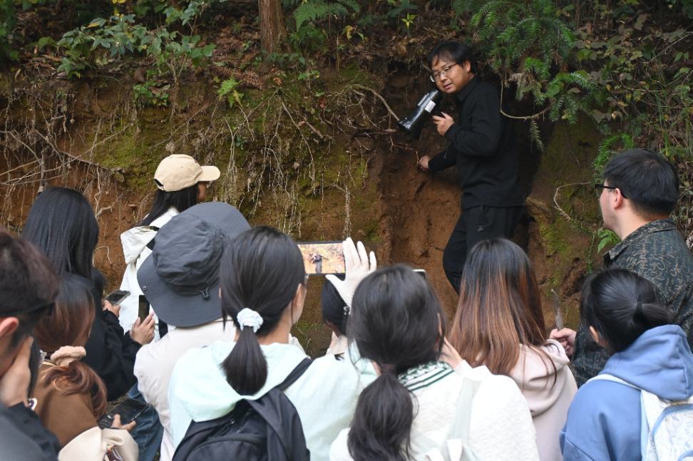 10月29日,实习队前往邓村进行土壤地理、地质地貌和植被实习。在易军老师和李胜龙老师的带领下,同学们挖掘了标准土壤剖面,测定了土壤水分、硬度、pH、色度等指标。李溪然老师讲解了邓村适合种茶叶的原因以及人类活动对于优势种的影响。李硕老师向同学们指出黄陵背斜形成与变化,让同学们寻找球状风化以及测量石英岩脉的产状。最后,队伍来到了白马洞,实地考察了长江中、上游的分界点以及喀斯特地貌溶洞的特征。