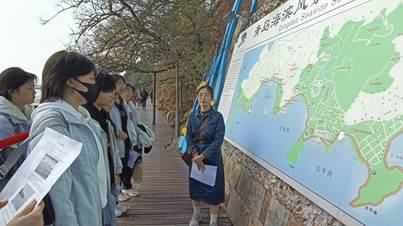 通过对青岛实地海岸地貌的勘察与分析,青岛小分队选择太平角公园这一地点进行野外研学,作为课堂活动的补充。组员逄晓娜作为负责人,在太平角公园带领学生识别岬角与基岩海岸,并指导学生描述其地貌景观特点。指导老师王璐薇也到场强调了本次野外研学的教学意义,呼吁同学们关注生活中的地理、身边的地理。