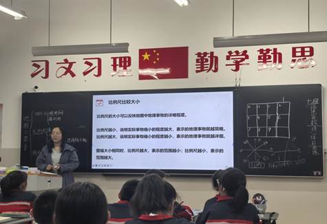 实习老师李瑞英在《认识与使用地图》授课中,以猜谜语的的形式进行新课导入,充分调动学生的学习兴趣和热情,后又对地图三要素:方向、比例尺、图例进行单独讲解,思路清晰,在讲解过程中不仅着重强调知识点本身,更注重其与真实生活的链接,如:生活中判断方向的方法有哪些等。