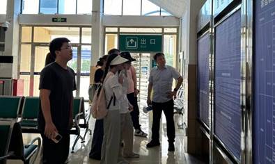 上午九时,师生一行抵达浠水南站。陈京老师首先就浠水南站的区位选址、站场建设、设施功能及周边配套等方面,进行了全方位介绍。同学们通过查询列车线路,深入思考了浠水对外联系的紧密程度与区域交通可达性;同时,从自助售票机、候车区等细节中,切身感受了现代化车站的高效与便捷。
