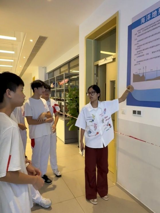 2025年10月16-17日,我院地理科学师范专业实习生王甜甜于中国人民大学附属中学海口实验学校,顺利完成了面向初高中学生的海洋与国防实验室参观讲解。王甜甜运用扎实的专业学识,生动解读了矿物岩石特性、海底地形构造以及海南本土矿产资源等地理知识,在实践一线有效提升了教学综合能力。