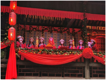 上午10点,实习团队正式开启在“三峡人家”的实习日程。我们到达的第一个景点是龙进溪,在这里欣赏到了土家族的特色表演——纤夫拉船、抛绣球、哭嫁等。同学们一方面感叹土家族人民的能歌善舞、热情好客,另一方面也从专业角度对旅游展演进行了批判性思考,从舞台的前后台设置、观众席设置等方面提出了一些改进建议。