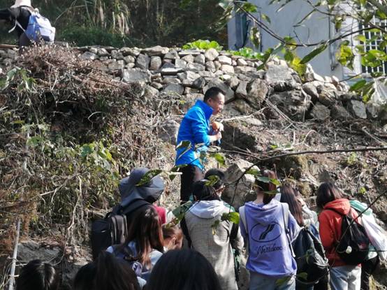 中午,同学们在车上稍作休整后,又前往滴水岩,由伍铁牛老师向同学们讲解该岩溶地貌的形成。伍铁牛老师介绍了滴水岩的形成原因,指出其形成原因与石灰岩的性质有关,由于水中的碳酸盐在底部不断沉积,该阶梯会不断增高。