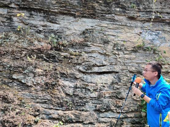 之后,实习队伍来到了下一实习地点,李硕老师考察了地层的结构特征,为我们讲述了震旦纪条带状的灰质岩并讲述其分层特点;在第三个实习点,李硕老师根据该实习点岩石的分层特征讲解了同沉积褶皱并解释了同一层岩石走向出现拐弯的原因。