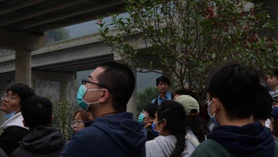 上午九时许,实习队伍抵达张家口桥。在张家口桥以北的河岸边,伍铁牛为队员们讲解了河流地貌与岩溶地貌,所有队员都认真听讲并作好记录,对河流阶地、河漫滩、峰丛、V型峡谷等典型地貌有了进一步的认识。随后,队员们沿着公路到达第二个实习点,在李硕的讲解下观察了鲕砾岩的颜色与结构,了解其矿物结构,并测量了岩石的产状。