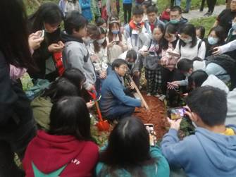 最后一个实习点位于小溪塔森林公园。经过一段山路,同学们到达了半山腰,开始了土壤地理实习。易军老师带领几名男同学修整好土壤剖面,同学们围绕着这个剖面,认真地听着老师的讲解,并测量了土壤的干湿度、颜色、质地、结构、紧实度等内容。随后,易军老师带领同学们对土壤进行染色实验,观察土壤水流入渗情况,同学们热情高涨,积极提问并主动实践,最终收获满满。