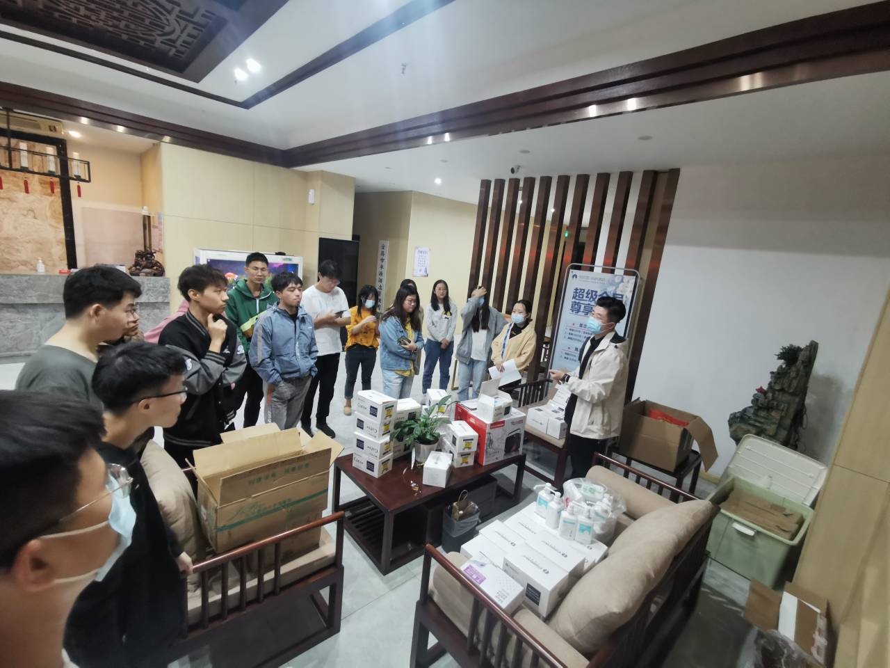 晚上八点,2019级年级主席刘育宇首先组织设备员开展了一个简短的会议,将各组的实习设备分发下去。随后进行了各组安全员的会议,会议提到实习的门禁制度以及同学们出入酒店要进行记录,还分发了各组的安全物资:速干酒精、酒精喷雾和口罩。晚上九点半,各寝室开始查寝。