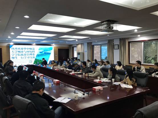 本次活动分两部分进行,第一部分,东湖风景区文旅局智慧旅游项目负责人何飞博士带领全体师生乘坐电瓶车参观了东湖绿道。参观活动由湖光序曲而始,经由华侨城建设的彩虹桥,再到听涛景区,然后参观了磨山景区。在参观过程中,东湖风景区工作人员具体介绍了东湖风景区的主题特色和建设理念,展示了东湖风景区将生态、人文与旅游大力结合的良好业态。第二部分,全体师生在东湖风景区管委会1号会议室观看了东湖智慧旅游系统,并与东湖风景区管委会徐铁柱副主任等进行了交流,徐主任重点介绍了东湖风景区公众号运营、智慧旅游板块与游客监管、东湖风景区的特色服务、经营管理等方面取得的成绩,以及遇到的问题和困惑。胡静老师对东湖风景区管委会的热情接待和精心安排表达了感谢,对徐主任的发言进行了回应。整个交流活动气氛热烈,内容深刻。