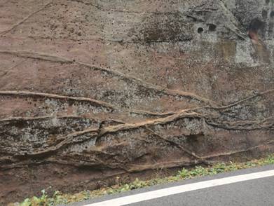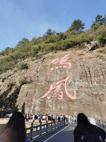 一个半小时车程后,同学们到达了位于远安县境内的鸣凤山。在山脚下,伍铁牛老师详细介绍了鸣凤山丹霞地层的情况,讲解了丹霞地貌“顶平,身陡,麓缓”的三大特点以及地层中岩筋的形成原因,同学们受益良多。