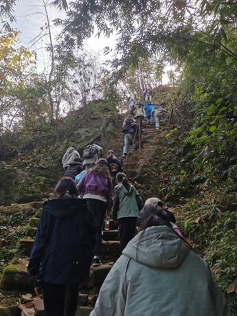 登山途中,有文人轶事勒于石上,具名山胜川展于眼底,起崎岖山路阻于道前;然城环学子执恭拜先贤之意,存探赜索隐之心,怀一往无前之志,互相帮携,彼此鼓励,先后攀上山顶。丹霞熠熠,耀学子苦行;朗日灼灼,期雏鸟凤鸣。