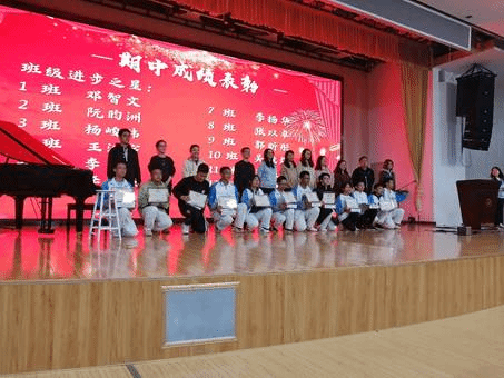 第二天,各类体育竞赛如火如荼进行着,同学们在赛场上赛出了风格,赛出了水平。晚上,高二年级在汇报厅举行了英语艺术节活动。活动刚开始,由年级主任杨老师给高二年级取得优异成绩的班级和个人颁奖,鼓励同学们再接再厉取得更好成绩。之后,由各班带来精彩的英语show。