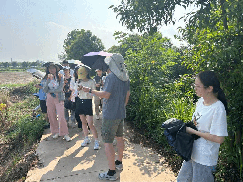 理论部分讲解结束后,各小组带上实习工具,分头前往田间开展实地调查。尽管天气很热,野外行走不便,但也挡不住同学们实习的热情。