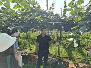 在猕猴桃生产基地负责人干总的带领下,实习队伍首先来到猕猴桃生产新区。负责人向大家介绍到,新区猕猴桃棚架综合了国外的高枝牵引技术,配备防爆膜和遮阳瓦,整个系统的牵引技术是目前最为先进的技术。通过该项技术,大大提高了猕猴桃树产量和延长果树产果年限。猕猴桃树寿命近百年,挂果期可达五十年,第三年结果,前期必须控制果树产量,为果树成长打下基础,第五年之后开始丰产期。目前该新园区最适合机械作业,除去人工梳花梳果以外,基本上采用机械进行施肥、除草。果树垄间种植野豌豆,待花期过后用为绿肥还田,增加土壤氮含量。