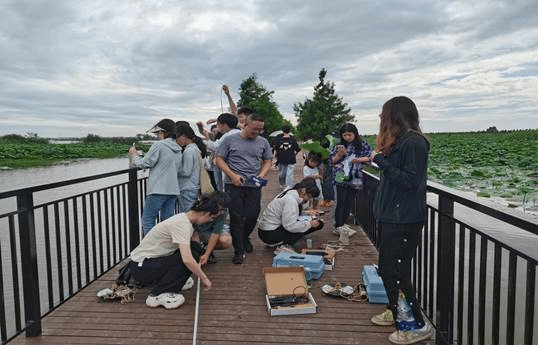 经过中午短暂的休息后,同学们在聂汉江老师和易军老师的带领下前往崇湖国家湿地公园进行参观和水质调查工作。在聂汉江老师和易军老师对测量指标和仪器讲解后,同学们在老师的指导下完成了分组进行测定。