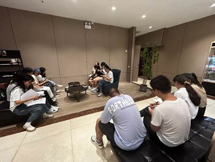 晚饭后,师生围绕禅意文化在小镇中的展示进行了学习和交流,同学们一一进行了发言。大家一致认为,拈花湾禅意小镇的禅文化主要体现在命名系统和景观建造上,各商铺、客栈、景点的命名均扣题禅文化,且景观建造风格、类型均与禅文化相呼应。此外,同学们还补充说明了为打造沉浸式体验,小镇工作人员的服装为禅修服,通过服装的改造和优化再次体现禅文化。老师听完同学发言后,又从一个游客的视角指出了小镇精准定位到禅文化的静和慢,小镇酒店外观和景区的景观保持了统一性,但景区需要多元化发展,不能单纯把精力集中到下午及晚上的活动组织,也应当组织开发一定的日间活动。