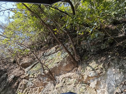从学校出发,不到半小时的车途便到达了昭山风景区,已经来过昭山多次的组长周金耀老师十分熟路的带领大家来到了昭山的西北后山,从古栈道开始了一段泥土小路的攀爬之旅。小路虽比较狭窄,但整体坡度起伏不大,只有一两处较难通过,在行走的路途中,老师和实习生们一同观察了古渡口,寻找到了河流侵蚀所形成的小沟渠,发现了根劈等作用下树木从岩石中长出,岩石的纹理以及土壤形成的迹象等等。