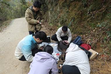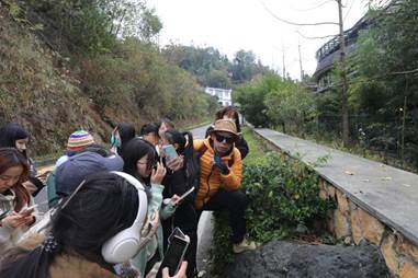 11月14日,师生前往邓村、白马洞开展野外实习。在邓村,同学们观察了经历多期构造运动发育的岩石节理。在李硕老师的带领下,学生在黄陵背斜核部观察到了共轭剪节理和球状风化后形成的“石蛋”。在道路的另一侧,学生仔细辨别闪长岩和嵌入其中的石英脉体,在岩壁上追索花岗岩细晶岩脉的踪迹,并测量了岩脉的产状。李溪然老师站在茶树梯田前,讲解了邓村茶叶种植的相关知识。