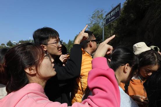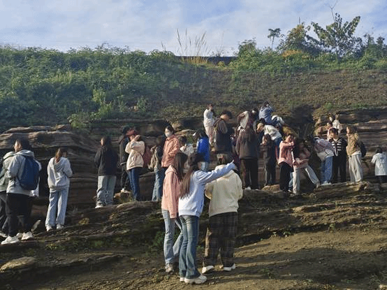 11月17日,在伍铁牛老师的带领下,同学们来到张家口村的一处河滩边,在这里回顾了河漫滩的形成过程、河流阶地、河曲等河流地貌相关知识,还观察了远处的“V”型谷、单面山、夷平面和正在发育中的峰丛。在滴水岩,伍铁牛老师还讲解了两级瀑布的成因。下午,师生一行来到了黄花场大坪阶金钉子剖面,学习了金钉子的相关知识,对宜昌的地质演化历史有了更深刻的认知。