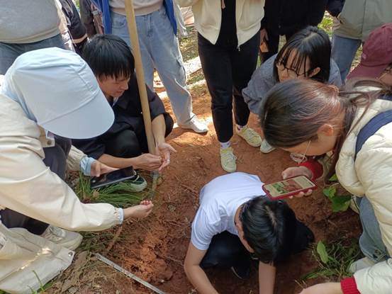 在小溪塔,易军老师和李胜龙老师带领同学们挖掘了土壤剖面,并观察了剖面性状。由于观察剖面位于坡顶,风化物易被带走,30cm深处便出现了成土母质层。在这里,同学们还学习了土壤分类的相关知识,采集了土壤各项数据,为本次实习的土壤学习部分画上了圆满的句号。