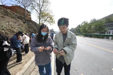 在嫘祖镇,同学们跟随老师的步伐,慢慢走过“中国化石第一街”,近距离观察中-上奥陶统宝塔组灰岩中的中华震旦角化石,在广场上了解当地相关的历史文化知识。在简单休整后,实习队到达王家湾“金钉子”——上奥陶统赫南特阶界线层型剖面,同学们在公路边的岩层剖面中观察了大小不一的笔石化石,这也是研究奥陶纪末期古气候、环境变化及生物灭绝事件的宝贵资料。在保护区外,同学们亲自采集了化石标本,感受到了地球历史的变迁。