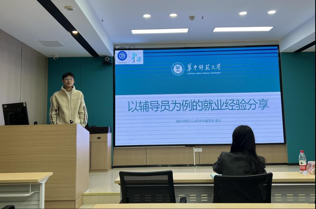 11月7日上午,城环学院职业生涯规划分享会在十号楼116会议室举行,2024级本科生辅导员蔡乐、2024级研究生辅导员赵萱仪担任主讲嘉宾,80余名研究生报名参加。