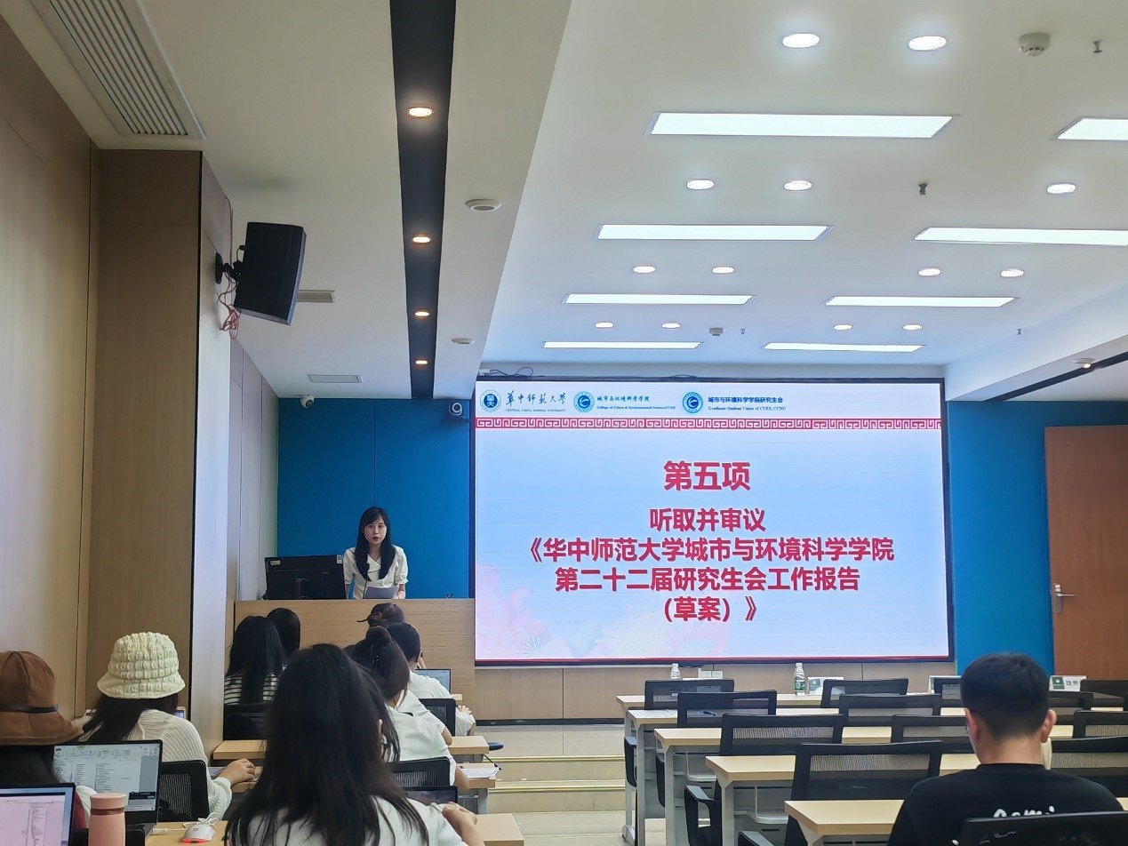 接下来王嵘蓉老师对城环学院研究生会过去的工作进行总结,而后由城环学院22届研究生会主席团成员王婧雯、易思歧、邓晗颖分别宣读《华中师范大学城市与环境科学学院第三次研究生代表大会代表资格审查报告》、《华中师范大学城市与环境科学学院研究生会工作章程》、《华中师范大学城市与环境科学学院第二十二届研究生会工作报告》、《华中师范大学城市与环境科学学院第二十三届研究生会主席团产生办法》。