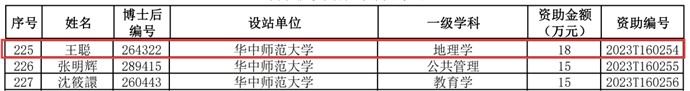 近日,中国博士后科学基金会公示了2023年度中国博士后科学基金拟资助人员名单。我院地理学博士后流动站王聪博士荣获中国博士后科学基金第16批(站中)特别资助,是我院2019年建站以来首批获得中国博士后科学基金特别资助者,资助金额为18万元。本次公布的中国博士后科学基金第16批特别资助(站中)资助人员中,地理学一级学科共13名博士后获得站中资助;华中师范大学共获批特别资助(站中)项目3项,特别资助(站前)项目1项。