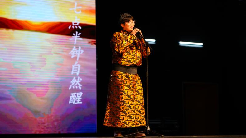2023级希拉嘎日身着民族特色服装,通过蒙古歌曲《一天》深情歌唱家乡的美丽风光;学院挂靠社团知音口琴社刘琰带来的口琴独奏《红玫瑰》吹出了青春的炽热与浪漫,赢得阵阵掌声;合唱《这世界那么多人》唱出了珍惜遇见、感受美好的温暖深情。