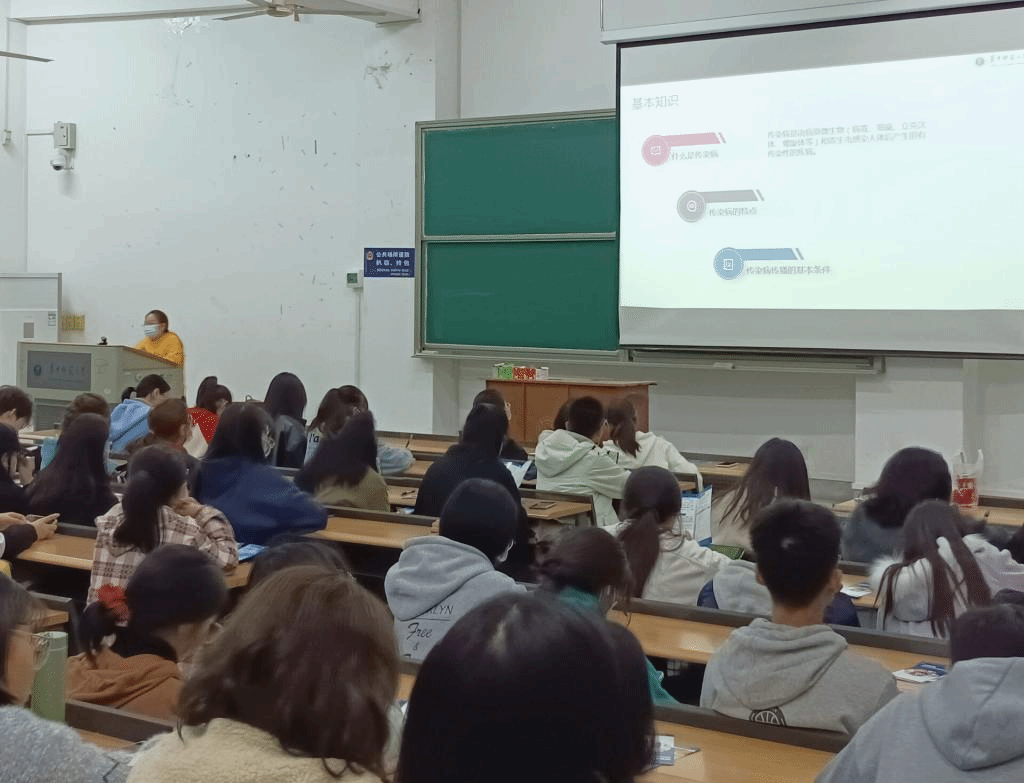 讲座时,朱娟从传染病的概念、特点及其传播条件三个方面入手,通过举例讲解分析传染病,对其基本知识进行简要介绍。她着重分析介绍了传染病的传播条件即:传染源、传染途径和易感人群,并分别深入解析,讲解各自定义、类型以及人群易感性的特征,为后面引导同学们了解传染病防控措施提供一定理论基础。