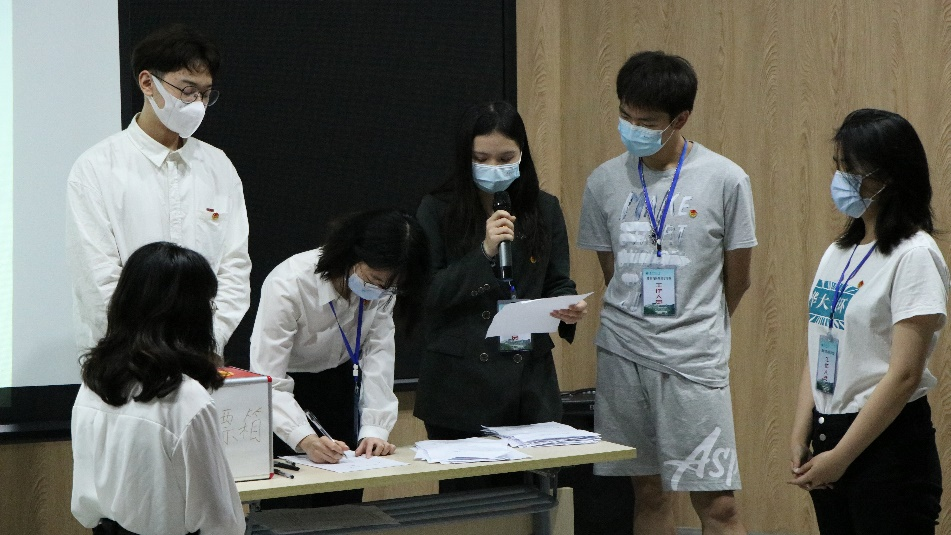 接下来大会进行学生会主席团候选人竞选演讲,候选人李丹飞、刘明珠、勇苏梦、薛晴依次上台进行个人竞选演讲,演讲结束后,各位学生代表进行现场投票,并在两位随机学生代表监督下完成唱票。紧接着由全体学生代表投票选举出席校级学生代表大会代表。
