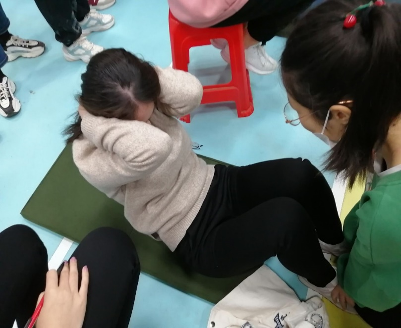赛前,裁判员详细介绍了比赛规则,各学院参赛队伍做好赛前准备,依次排队入场,城环学院的运动健儿已蓄势待发。比赛以一分钟为限,以学生仰卧起坐规范动作的完成个数计分。计时一开始,城环学院参赛选手迅速进入比赛状态,双手抱头,反复起躺,争分夺秒的同时更力求姿势标准。方形的软垫上,选手们手扶后脑,腹部发力,与之配合的队员则双手紧扶运动员脚踝,为其带去支持的力点。城环学院30位参赛选手毫无懈怠,全力以赴,赢得了现场喝彩。