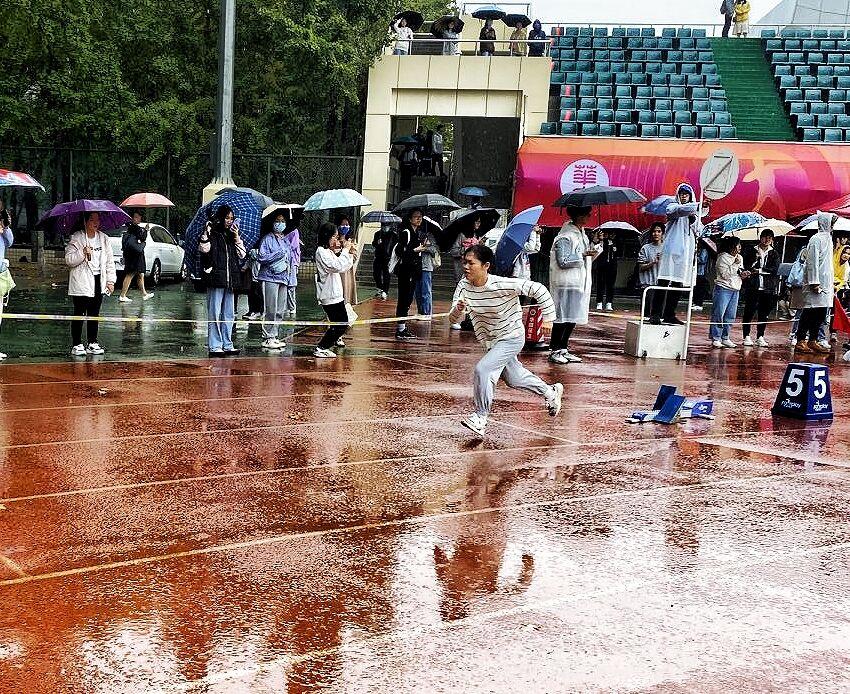 第七组的李心仪是第一次参加400米的比赛,尽管结果不尽人意,但她勇于尝试,永不言弃的精神值得我们城环学子学习。对于第一次参赛,李心仪表示:“我是真的不知道跑400米原来这么累。室友都跟我说400米比800米累,但是我觉得400米比800米少一圈,应该没事,但是发现后面根本加速不起来。”而对于自己的成绩,她笑道:“重在参与嘛,而且其实淋着雨跑也很爽的。”