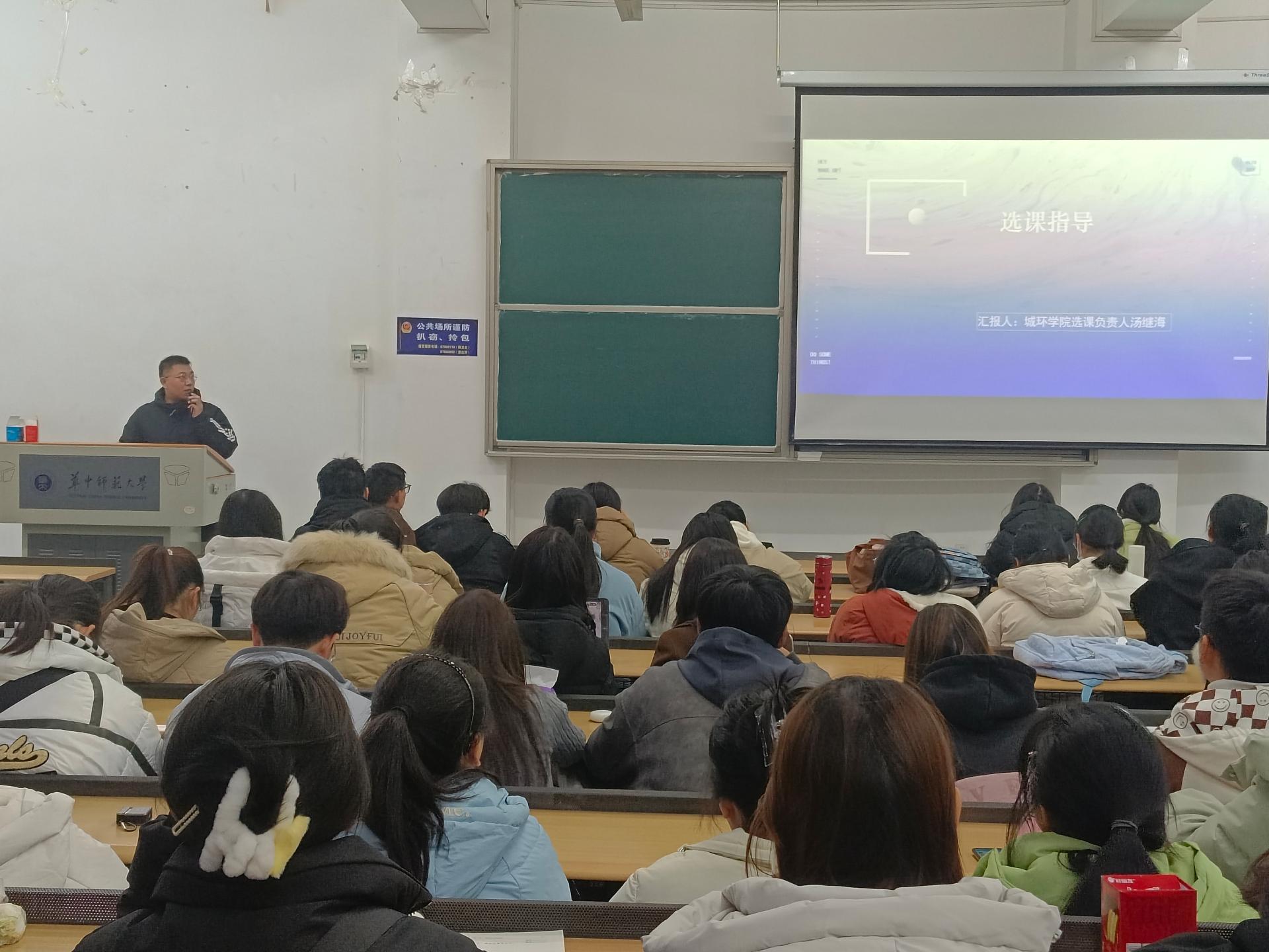 接着,汤继海作选课指导。他详细介绍了学校的选课机制、选课内容,重点讲解了学校对于英语课、通识核心课的安排,并推荐选课方法。他建议同学们认真阅读培养方案、了解老师的风格、提前规划方案并依据初选结果调整方案。