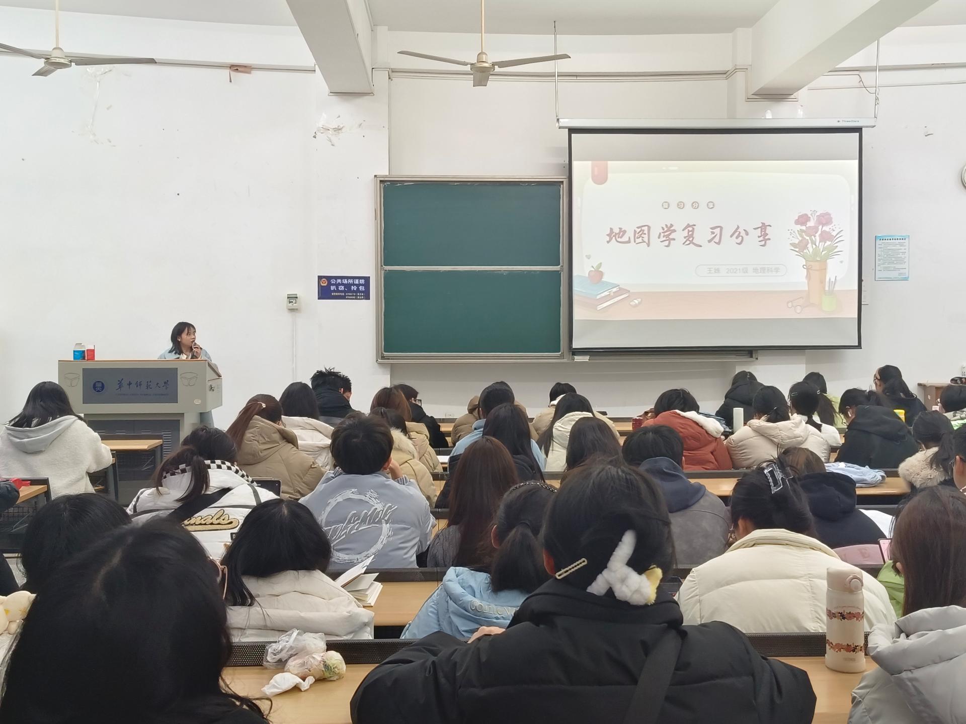 最后,王姝作地图学复习分享。她针对考试内容提出自己的看法,建议同学们明确重点知识,记忆为主,理解为辅,捋清细节,把握内在联系。然后她详细介绍了考试题型并从复习地点、复习资料、复习方法三方面分享自己的备考经验,她指出备考时可以搜集往年试题、构建思维导图,并就考试范围、知识难点、上机操作等方面进行答疑。