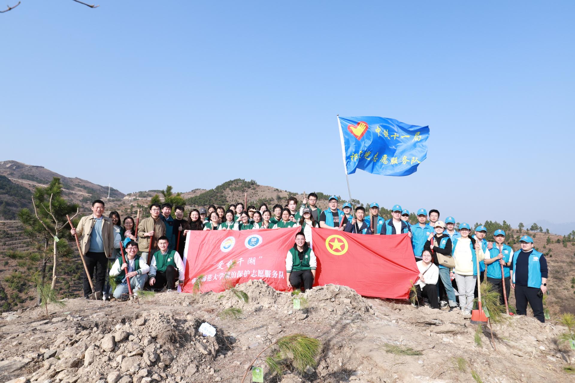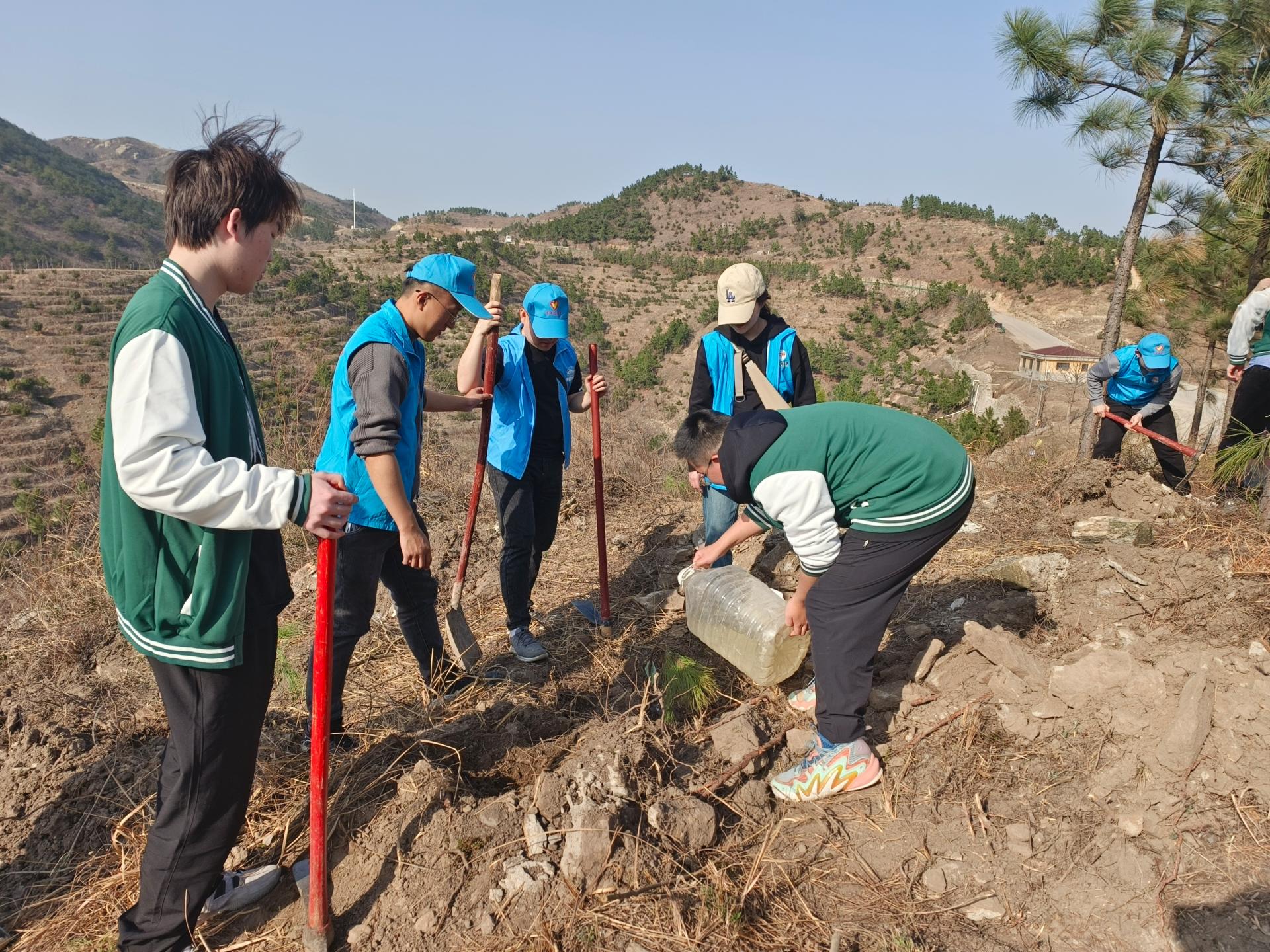 为迎接全国第46个植树节,当天下午,中铁十一局“祁建光志愿服务队”和我院团委组织的“爱我千湖”华中师范大学湖泊保护志愿服务队来到黄陂区李家集驻程岗村龙王尖开展“为生态添绿·为团旗添彩”植树活动。迎着轻柔的春风,踏着潮湿的土壤,志愿者在领取树苗后,手持铁锹、锄头、水桶登上来到植树点。他们三四人一组,挖土凿坑,抗苗立木,培土浇水,分工明确,配合默契,饱满的热情、昂扬的风貌投入到植树行动中,在山头形成了一幅亮丽的“早春图”。经过1个小时的努力,一小片松叶林初见雏形,同学们纷纷与自己种下的树苗合影留念,并为它挂上“责任牌”。志愿者何旭表示,“虽然出了一身汗,沾了一身土,但能用自己的双手为美丽家园种下新绿,增添生机,不负大好春光”。