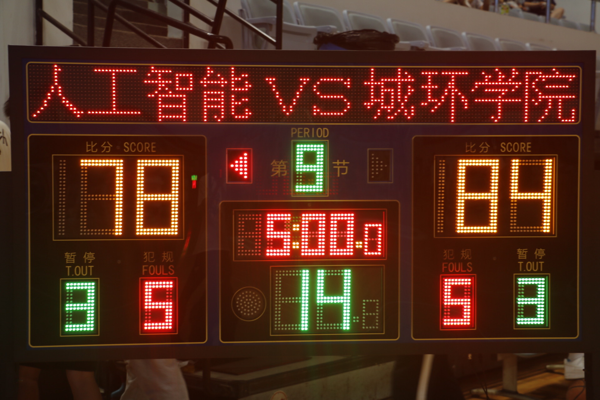 第四节比赛开始,双方队员你争我夺,比分持续处于胶着状态。人工智能男篮进攻势头明显增强,我方也不甘示弱,兰晓康连续命中两记三分球,冯家驹也拿下关键一球,比分最终定格在63:63的平局。场上在争夺,场下也在比拼,双方队伍围绕赛场跑旗,为队员们加油鼓劲。