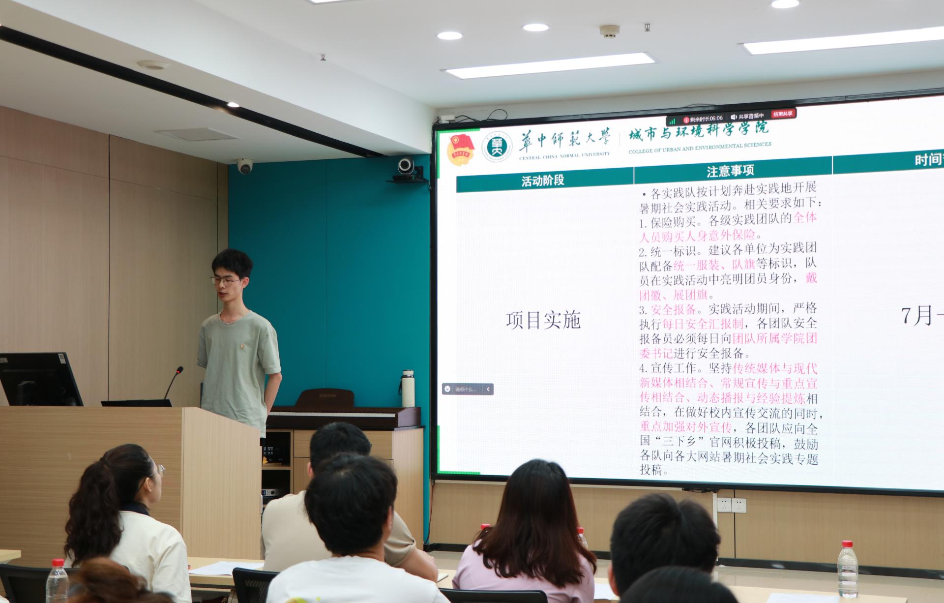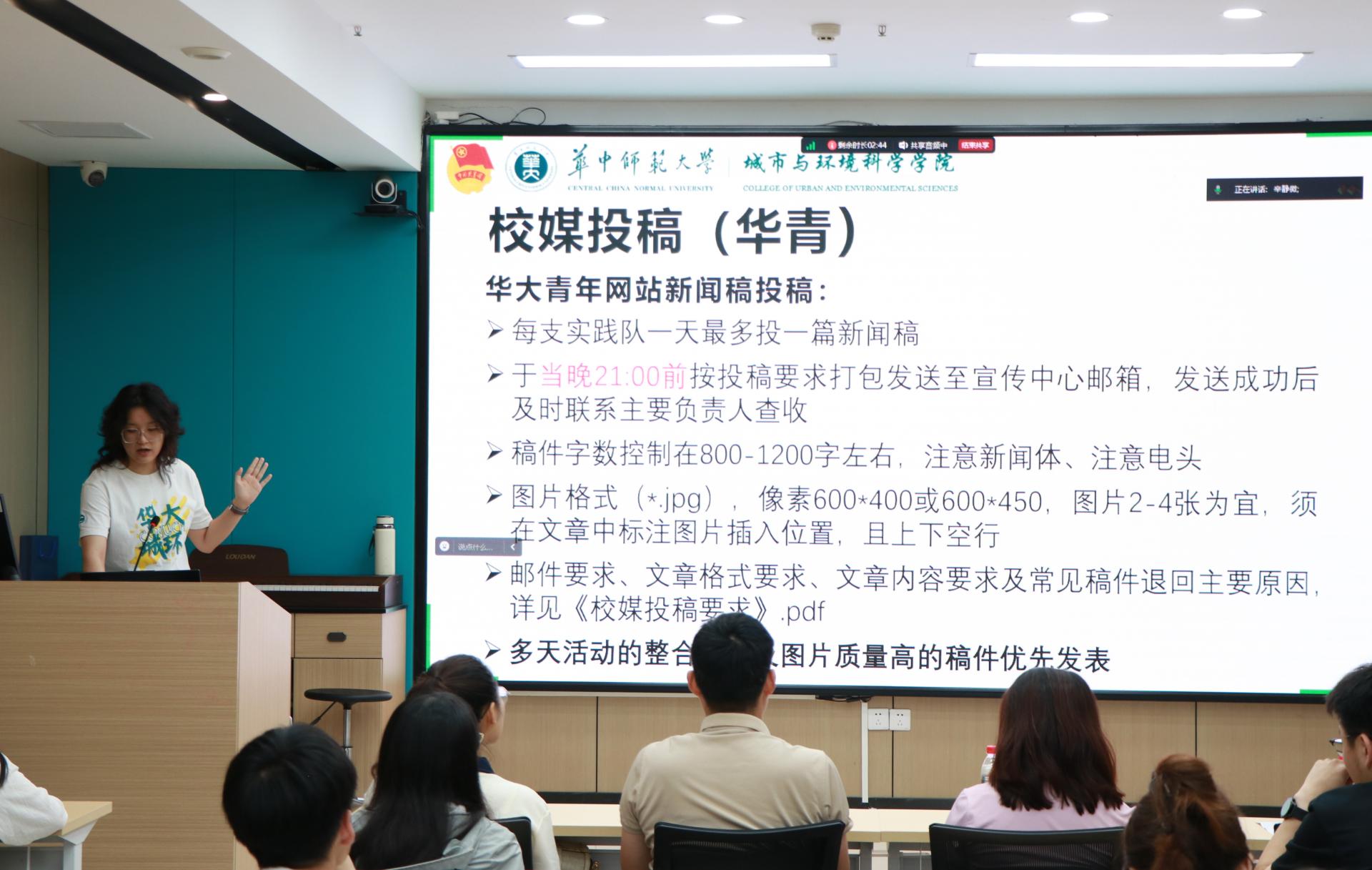 院团委副书记(学生)孙锦超向同学们介绍了暑期社会实践活动的申报流程,提醒各实践队按要求开展实践活动。院团委宣传中心主要负责人唐妤婕进行宣传培训,重点讲解了校媒、院媒以及校外媒体新闻稿投稿须知,鼓励各实践队多渠道开展宣传工作。