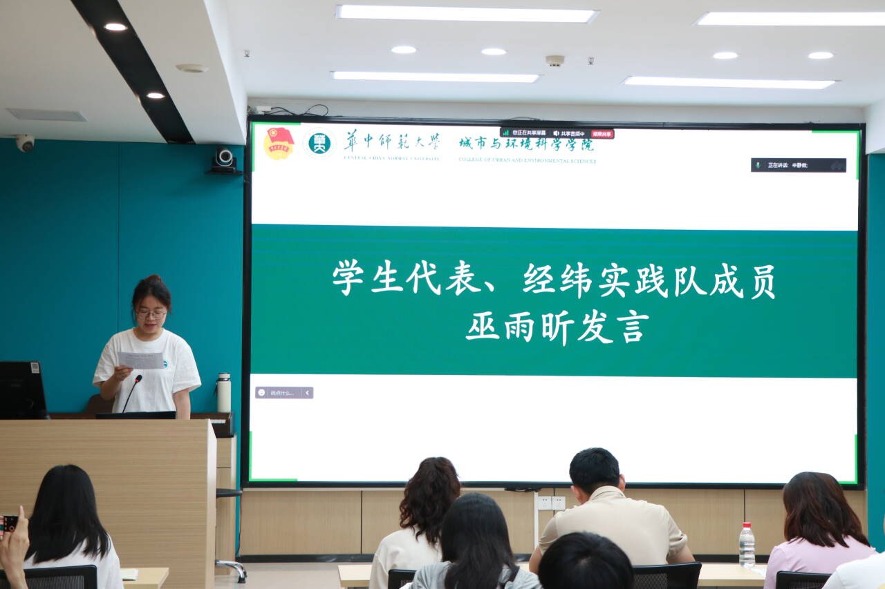 经纬实践队代表2022级地理科学专业本科生巫雨昕在动员会上发言,她表达了投身社会实践的热情和决心,承诺将严格遵守各项纪律,时刻注意自身形象,恪守职责,以最饱满的热情投身实践活动,号召同学们积极响应社会需求,将青春的汗水播撒在祖国大地上。