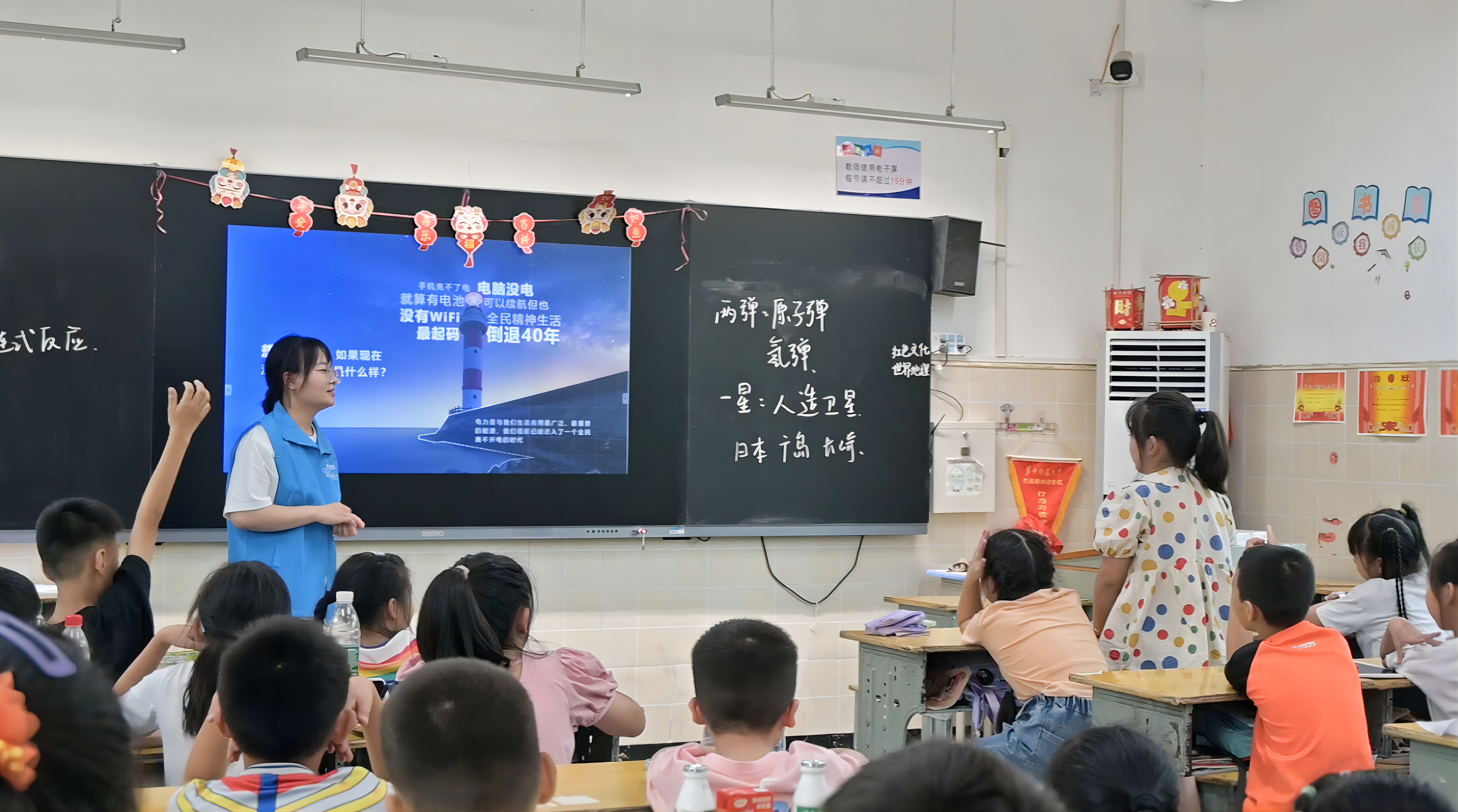 在核能发展科普课上,实践队员黄太蕊以时间为线索,通过播放视频和展示图片,向学生们介绍了“两弹一星”的研制背景,详细讲述了我国第一颗原子弹、氢弹和人造卫星的研制过程。随后,黄太蕊梳理了新中国在“两弹一星”领域取得的重大突破,并重点介绍了中国科学院院士王淦昌的故事,带领学生们感悟前辈们热爱祖国、无私奉献、自力更生、艰苦奋斗的“两弹一星”精神,激发了新一代青少年们对科技创新和强国建设的热情。